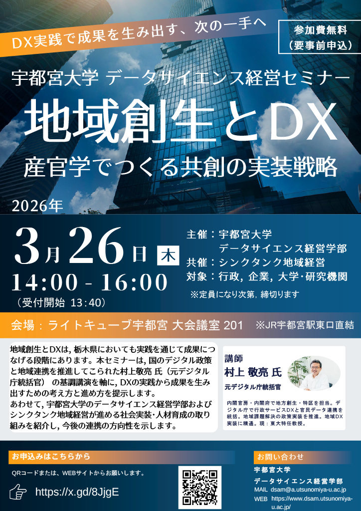 宇都宮大学データサイエンス経営学部とシンクタンク地域経営が連携し、このたびデータサイエンス経営セミナー「地域創生とDX ~産官学でつくる共創の実装戦略~」を開催します。
